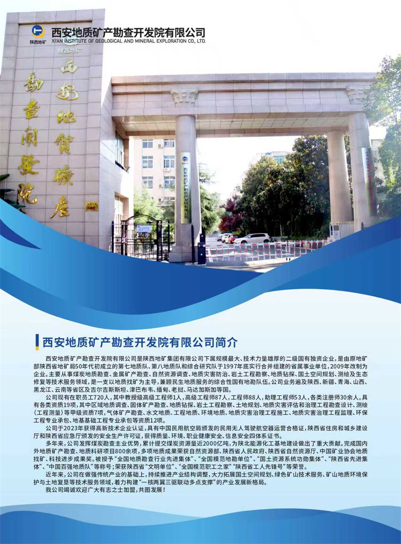 西安地质矿产勘查开发院有限公司是陕西地矿集团有限公司下属规模最大、技术力量雄厚的二级国有独资企业,是由原地矿部陕西省地矿局50年代初成立的第七地质队、第八地质队和综合研究队于1997年底实行合并组建的省属事业单位,2009年改制为企业。主要从事煤炭地质勘查、金属矿产勘查、自然资源调查、地质灾害防治、岩土工程勘察、地质钻探、国土空间规划、测绘及生态修复等技术服务领域,是一支以地质找矿为主导,兼顾民生地质服务的综合性国有地勘队伍。公司业务遍及陕西、新疆、青海、山西、黑龙江、云南等省区及吉尔吉斯斯坦、津巴布韦、缅甸、老挝、马达加斯加等国。