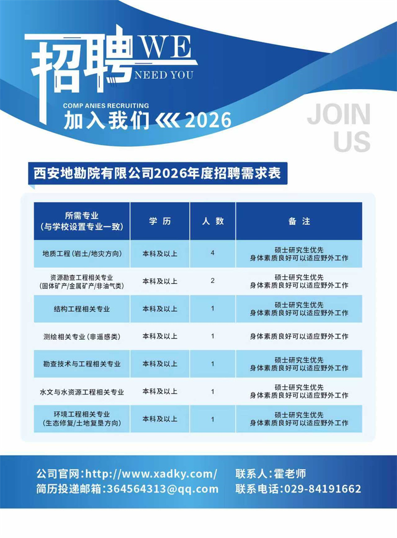 当前位置:新闻中心 > 新闻中心 > 西安地质矿产勘查开发院有限公司2026年招聘简章