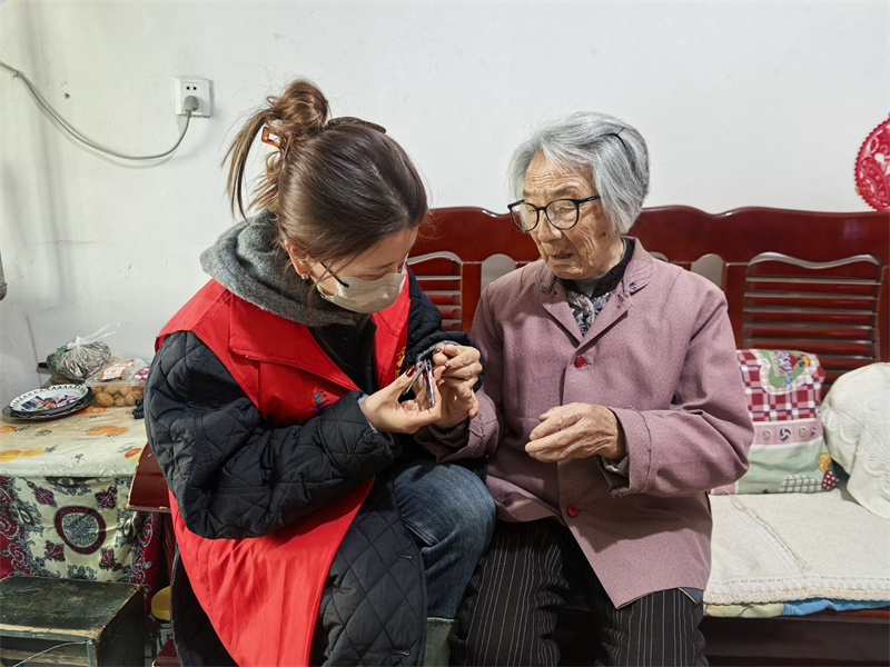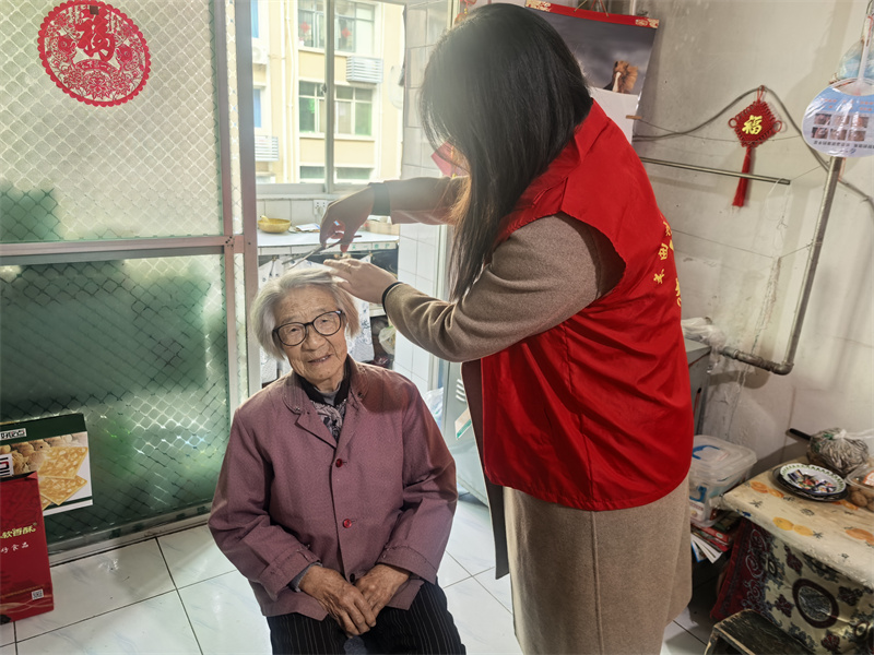 活动中,志愿者们先后走进85岁独居老人章玉华和81岁独居老人唐朝科家中。大家分工明确,配合默契,手持扫帚清扫地面,擦拭门窗玻璃,帮助老人整理房间杂物。经过一番辛勤劳动,家中原本积尘的角落变得干净整洁,居室环境焕然一新。在做好基础卫生清洁的同时,志愿者们更注重细节关怀。他们化身“托尼老师”,搬来小板凳为老人理发,耐心地为老人修剪指甲。大家一边陪老人拉家常,一边细致地服务,让平日里冷清的小屋充满了欢声笑语。此外,志愿者们还主动检查了老人家中水电设施,排查安全隐患,切实保障老人的居家安全。